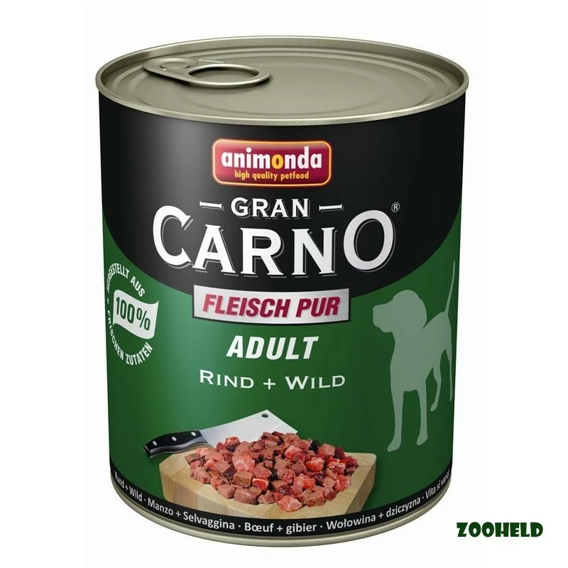 „Fleisch pur“ lautet der Zusatz auf dieser Dose aus der bekannten GranCarno Serie von Animonda, denn dieses reine Fleischmenü auf der Basis von schmackhaftem Rindfleisch mit einem Extra-Anteil von Wild und Geflügel, besteht zu 98 % aus Fleisch und Innereien und wird durch zugesetzte Vitamine und Mineralien zu einer ausgewogenen Vollnahrung, die Ihren Hund mit allem versorgt, was er täglich benötigt. Die getreidefreie Kost wird ausschließlich aus schlachtfrischem Fleisch schonend zubereitet, sodass der ursprüngliche Fleischgeschmack und der leckere Geruch erhalten bleiben. Die naturbelassenen Fleischstücke mit ihrer intakt gebliebenen Faserstruktur machen schon beim Öffnen der Dose deutlich, dass nur bestes Fleisch und wertvolle Innereien in Lebensmittelqualität verarbeitet werden, während minderwertiges Formfleisch oder sogar Tiermehle natürlich nicht eingesetzt werden. Innerhalb unseres Zooheld-Futtertestes haben unsere Hunde sehr viele GranCarno Sorten selbst getestet, was uns von der hohen Qualität überzeugt hat, zumal auch eine sehr gute Akzeptanz der Animonda Produkte bei den Hunden feststellbar war. Ausdrücklich erwähnen wollen wir, dass die GranCarno Produktlinie sehr abwechslungsreich ausgefallen ist, sodass jede Sorte tatsächlich einen ganz eigenen Charakter besitzt – den „Kampf gegen die Langeweile am Fressnapf“ hat Animonda deutlich gewonnen, wovon natürlich auch Ihr Schützling profitieren kann, wenn ihm immer wieder ganz neue Geschmackserlebnisse geboten werden. Da auch uns bei Zooheld eine abwechslungsreiche Kost ebenso wichtig ist wie deren Ausgewogenheit und Schmackhaftigkeit, bieten wir Ihnen natürlich sämtliche GranCarno Sorten günstig an und liefern Ihre bestellte Ware schnell und bequem – ab einem Warenwert von 29 € auch ohne Versandkosten.