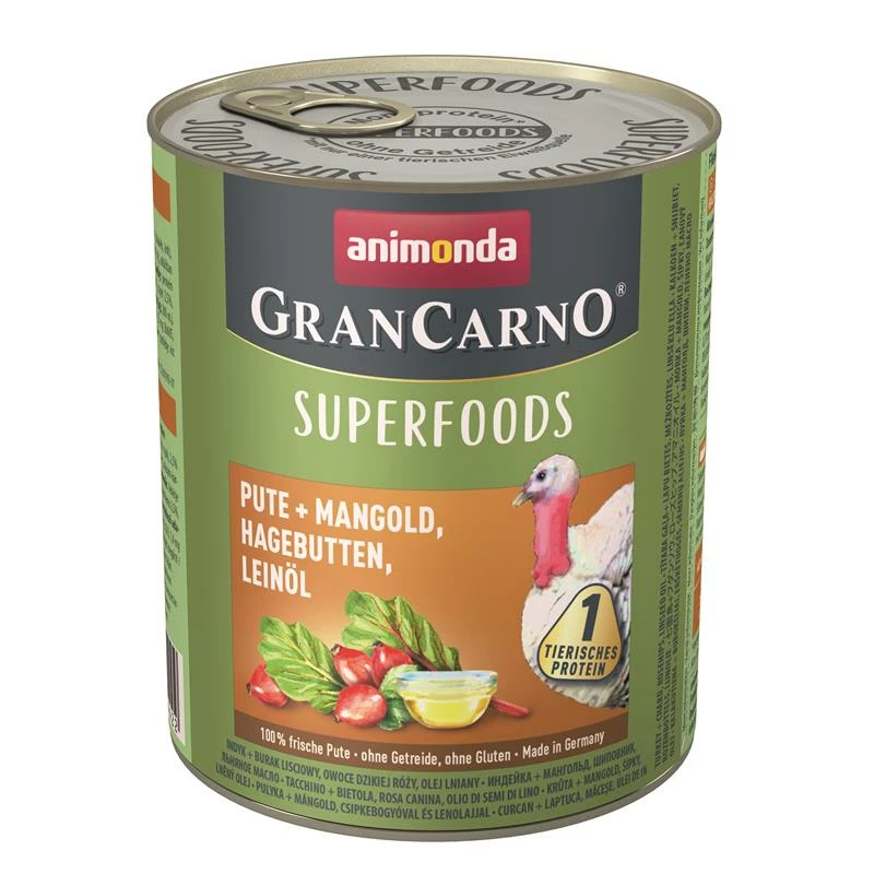 68 % Pute (Herzen, Fleisch, Leber, Magen, Hals), 2,5 % Mangold, 0,3 % Hagebutten, 0,2 % Leinöl, Calciumcarbonat, Natriumchlorid.