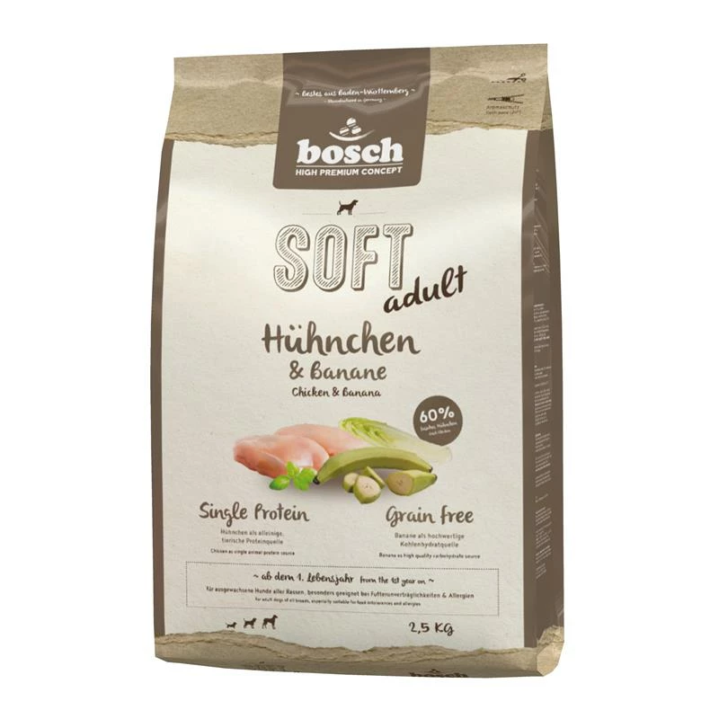 Aus der HPC Soft Serie von bosch mit getreidefreien Trockenfuttern bietet Ihnen Zooheld die Sorte Hühnchen & Banane an, die Sie hier im 2,5 kg Beutel bestellen können. Hühnchen & Banane besteht zu 60 % aus feinem Hühnchenfleisch, das in diesem soften Trockenfutter die tierische Monoproteinquelle bildet. Durch ihren erhöhten Feuchtegehalt sind die Kroketten dieses schmackhaften Trockenfutters angenehm „soft“, was Ihrem Hund ein ganz besonderes Kau- und Geschmackserlebnis bietet. Der hohe Gehalt an frischem Hühnchenfleisch ist für den Hund als Fleischfresser sehr artgerecht und verleiht diesem Alleinfutter eine außergewöhnliche Proteinqualität. Da es sich um eine strikt getreidefreie Kost handelt, werden als alternative Kohlenhydratquellen stärkehaltige und leicht verdauliche Bananen (mindestens 8 %) und nahrhafte Kartoffeln eingesetzt, sodass Sie Ihrem Hund ein sehr bekömmliches Trockenfutter anbieten können, das die Verdauung nicht belastet. Wir empfehlen generell, sich die Zutatenlisten unter Details näher anzuschauen, damit Sie sich ein Bild davon machen können, was die Kost Ihres Hundes genau enthält. Bei Hühnchen & Banane finden Sie dort neben den bereits genannten Rohstoffen noch weitere gute Zutaten, deren gesundheitlichen Nutzen für Ihren Hund wir jetzt kurz beschreiben wollen: