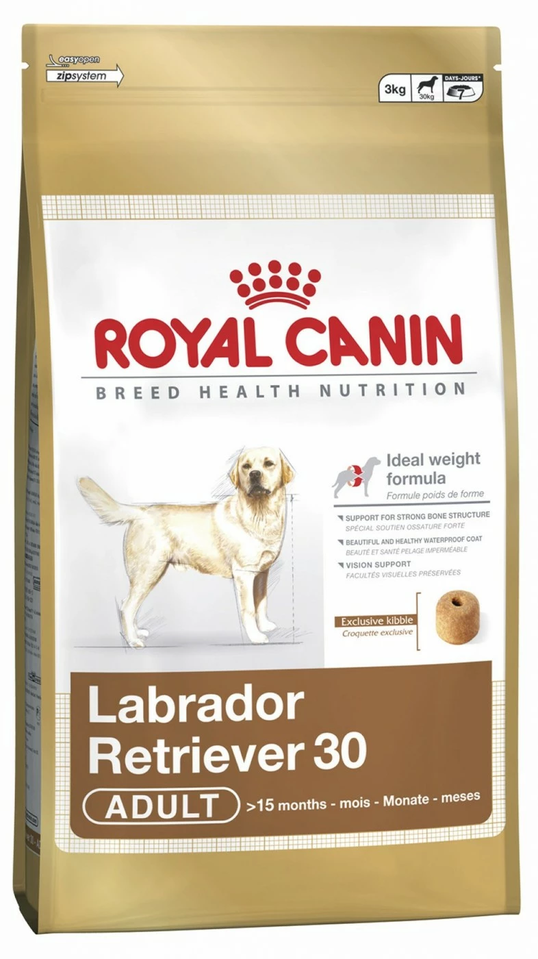 Unter den zahlreichen Futtermitteln, die Sie vom bekannten Hersteller Royal Canin bei Zooheld günstig online bestellen können, gibt es auch sehr viele Spezialfutter aus der Breed Serie, die jeweils speziell abgestimmt sind auf den besonderen Ernährungsbedarf einzelner Hunderassen. Labrador Retriever 30 ist gedacht für alle erwachsenen Hunde über 15 Monate und bietet ausgewogene Ernährungslösungen für bestimmte gesundheitliche Problembereiche, für die Hunde dieser Rasse bekannt sind. Dabei handelt es sich um folgende Punkte, die wir gleich näher erläutern wollen: Erhaltung des Idealgewichts, Gelenk- und Hautschutz sowie Erhalt der natürlichen Sehkraft.